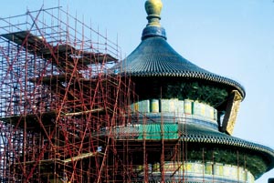 中新網(wǎng)1月11日電 北京天壇核心景觀祈年殿古建筑近日正式開工修繕,整個(gè)工程計(jì)劃于2006年9月1日前竣工。北京日?qǐng)?bào)報(bào)道,屆時(shí)將恢復(fù)其康乾盛世時(shí)的歷史原貌。這是自1971年大修后,祈年殿首次進(jìn)行較大范圍的修繕。