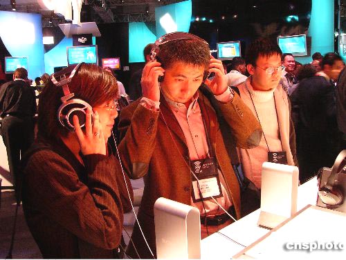 一月六日在美國拉斯維加斯開幕的二00五國際消費(fèi)電子展,吸引世界各地的商家及消費(fèi)者。圖為來自中國大陸的參觀者在索尼展臺前試聽音響。作者:潘旭臨