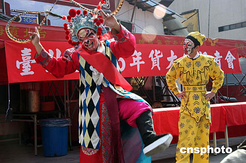 此刻街面上的清凈也絲毫沒有影響媒體記者的熱情,“二00五臺(tái)北年貨大街開幕記者會(huì)”就在消防演習(xí)后在城隍廟前隆重召開了。裝扮成美猴王、雞王的演員亮麗出場(chǎng),分別代表去年和新年的“值年星君”授綬帶、傳金寶進(jìn)行交接。一群幼兒園的孩子被這場(chǎng)小演出吸引,拉著老師和猴王、雞王合影,并爭(zhēng)相摸起元寶。閃光燈瞬時(shí)四起,捕捉著這些孩子天真可愛的笑容。
