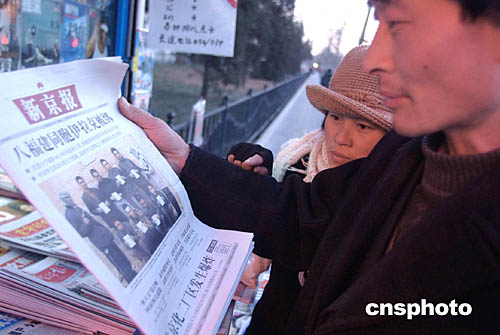 一月十九日,北京市民在書報(bào)亭前購(gòu)買登載中國(guó)福建八名勞工在伊拉克遭劫持消息的報(bào)紙,詳細(xì)查看相關(guān)新聞。作者:韓藝冰