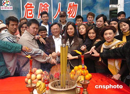 香港電視劇《危險(xiǎn)人物》19日在香港亞洲電視臺(tái)舉行開鏡拜神儀式﹐劇組制作總監(jiān)梁立人和節(jié)目主持人翁靜晶及劇組全體人員到場(chǎng)誠(chéng)心拜神﹐祈求拍攝順利。中新社記者:趙振清
