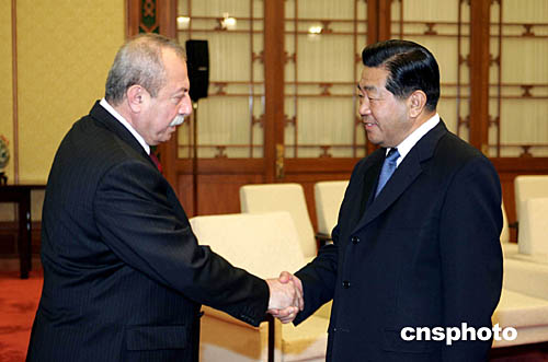 中國(guó)全國(guó)政協(xié)主席賈慶林一月二十日在北京人民大會(huì)堂會(huì)見來訪的伊拉克臨時(shí)政府副總統(tǒng)沙維斯。沙維斯對(duì)中國(guó)公民在伊拉克遭到武裝脅持事件表示遺憾,并表示伊方將盡一切努力使人質(zhì)安全獲釋。中新社記者:毛建軍