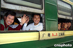 春運(yùn)拉開帷幕,在廣東中山市打工的外來人員愉快登上廣州開往上海的三五○次春運(yùn)臨時(shí)客車。今年廣州鐵路集團(tuán)春運(yùn)期間將安排一百四十二對(duì)臨客列車,接送返鄉(xiāng)過年旅客。作者:丁勇