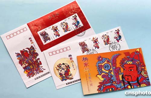 北京市郵票公司為配合國家郵政局于2005年2月1日發(fā)行《楊家埠木版年畫》特種郵票(1套4枚),特設(shè)計(jì)印制了該郵票的首日封(中)、小全張首日封(左)、郵折(右)等郵品,并將與郵票同日發(fā)行!稐罴也耗景婺戤嫛诽胤N郵票名稱分別為“門神”、“連年有余”、“喜報(bào)三元”、“天女散花”,面值均為80分,小全張售價(jià)4.80元。“楊家埠木版年畫”在明代時(shí)起源于山東濰坊市濰縣楊家埠,盛于清代,流傳至今,堪稱為民間美術(shù)珍品。作者:鄒憲