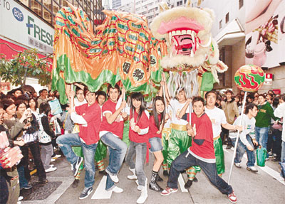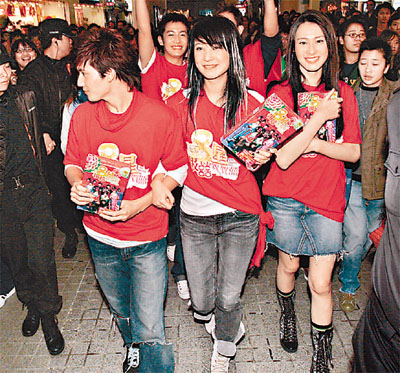 雖然Twins身在臺灣而缺席,但英皇五星的出現(xiàn)同樣哄動,加上打鑼打鼓的舞龍儀式,令現(xiàn)場氣氛推至高潮!熱情的歌迷重重包圍,令五星寸步難行。當(dāng)開始派發(fā)揮春時,歌迷瘋狂上前搶奪,場面一發(fā)不可收拾,為顧及安全,沒到兩分鐘,五星就連忙登車離去。身穿迷你短裙的Isabella,活動未開始前,還表示不擔(dān)心混亂中被摸,但當(dāng)她被擠在人群當(dāng)中,不禁表現(xiàn)驚慌,一直雙手護(hù)胸。而Yumiko則由Boy'z的Kenny保護(hù),最后五星在保安開路下離開,此時才可以輕松地向Fans揮手道別。
