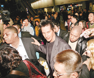 乘坐十多小時機程的基努出閘時略帶倦容,不過仍很友善的向Fans揮手,并上前合照簽名,期間記者蜂擁而上爭相拍照,場面一度混亂,更有女Fans只顧追星連手袋掉在地上也不理。問基努對今次行程有何期望,他說:“希望是一個開心愉快旅程!今次是第一次來香港!”其后他登車往下榻的灣仔君悅酒店,據(jù)知酒店方面特別安排了七架專車接送,派頭十足。