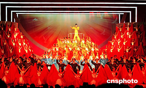 由七百多名解放軍及武警官兵參演的2005年軍民迎新春文藝晚會(huì)《春綠大地情滿懷》,二月二日晚在北京中國(guó)劇院舉行。中國(guó)國(guó)家主席胡錦濤、吳邦國(guó)、溫家寶等國(guó)家領(lǐng)導(dǎo)人與首都軍民歡聚一堂,共賀新春。圖為解放軍總政治部歌舞團(tuán)大牌演員彭麗媛的壓軸節(jié)目《高歌向明天》的表演。中新社記者:王麗南