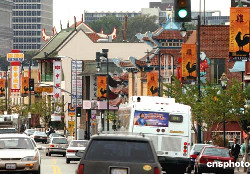 圖:洛杉磯中國(guó)城張掛雞年彩旗