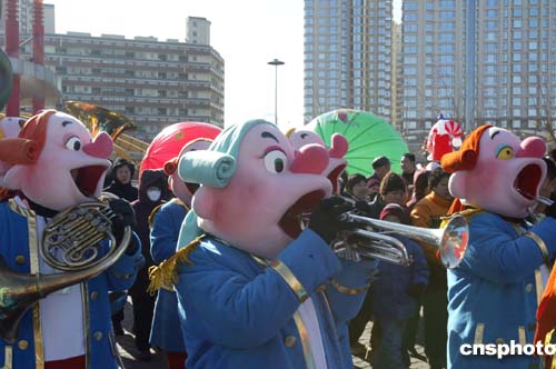 二月九日中國(guó)傳統(tǒng)春節(jié),盡管天寒地凍,但是在北京朝陽(yáng)公園的國(guó)際風(fēng)情節(jié)上卻激情燃放。當(dāng)天開(kāi)幕的二零零五年北京朝陽(yáng)國(guó)際風(fēng)情節(jié),為京城的市民奉獻(xiàn)了一臺(tái)中西文化大餐。圖為開(kāi)幕式上盛裝游行隊(duì)伍中的卡通樂(lè)隊(duì)。作者:任海霞