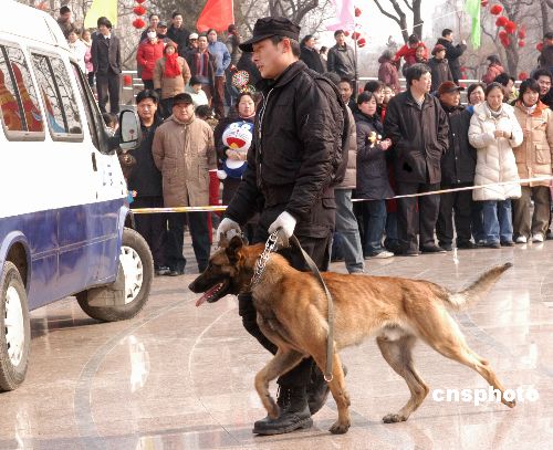 北京警方在春節(jié)期間增加了一項特殊工作,二月十二日公安警犬隊訓(xùn)犬員,乘警車,牽警犬在第二十二屆春節(jié)龍?zhí)稄R會主會場,為千名游園觀眾表演警犬搜捕、跨越障礙、緝毒、擒敵等節(jié)目。作者:鄒憲