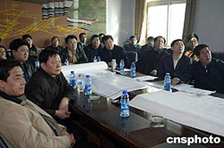 二零零五年二月十六日上午,國家安全生產監(jiān)督管理局局長王顯政(前右一)、副局長趙鐵錘(前左一)一行代表國務院安委會事故調查組,在發(fā)生特別重大瓦斯爆炸事故的遼寧海州立井事故現(xiàn)場,聽取事故搶險小組對事故情況以及搶險情況的匯報。遼寧省省長張文岳(前左二)、副省長劉國強(前右二)也參加會議。作者:盛佳鵬