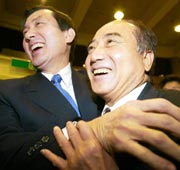 中新網(wǎng)2月24日電 據(jù)臺灣媒體報(bào)道,國民黨主席連戰(zhàn)夫婦昨晚返回臺灣,約有近四十名“立委”及七十名黨部人員前往接機(jī),黨主席熱門人選的“立法院長”王金平、臺北市長馬英九都提早在機(jī)場等待,親民黨則派出秘書長秦金生、“立院”黨團(tuán)總召集人劉文雄到場接機(jī),王馬兩人還多次互相擁抱,展現(xiàn)團(tuán)結(jié)氣氛。