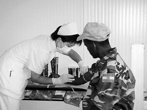 護(hù)士長(zhǎng)吳樂(lè)燕一打開(kāi)非洲之行的個(gè)人相冊(cè),一張張照片似乎還在散發(fā)著西非大地的灼熱。她介紹說(shuō),利比里亞因緊鄰赤道,陽(yáng)光中的紫外線強(qiáng)烈,白天的氣溫有時(shí)高達(dá)40多攝氏度。醫(yī)療分隊(duì)的女隊(duì)員們剛剛抵達(dá)時(shí),工作起來(lái)是汗如雨下,一天下來(lái)皮膚就被灼傷變黑,繼而脫皮,就連在國(guó)內(nèi)花好幾百元準(zhǔn)備的防曬化妝品也不管用。從此,愛(ài)美的她們干脆把鏡子藏進(jìn)了旅行箱。