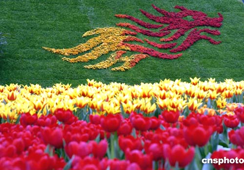 正在香港維港舉行的“香港花卉展覽”上,大型花卉“郁金香”在香港標志飛龍的襯托下鮮艷耀目。作者:洪少葵