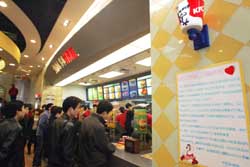 三月十七日,上海肯德基均在餐廳里張貼聲明,解釋“蘇丹紅一號(hào)事件”。十六日晚,在肯德基新奧爾良烤翅和新奧爾良烤雞腿堡調(diào)料中發(fā)現(xiàn)了“蘇丹紅一號(hào)”成分。為了確保萬無一失,該公司決定立即在全國所有肯德基餐廳停止售賣新奧爾良烤翅和新奧爾良烤雞腿堡兩種產(chǎn)品,同時(shí)銷毀所有剩余調(diào)料。圖為徐家匯一家肯德基餐廳里張貼了聲明。作者:潘索菲