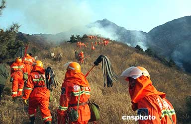 4月4日,河北省井徑縣南王莊鄉(xiāng)蘆莊村的金華寺山旅游景點(diǎn),發(fā)生大面積火災(zāi)。河北省森林防火應(yīng)急分隊(duì)武警緊急出動(dòng)300余名兵力趕赴火災(zāi)現(xiàn)場(chǎng),經(jīng)過(guò)5個(gè)多小時(shí)的激烈奮戰(zhàn),終將熊熊大火撲滅。據(jù)查大火由清明燒紙引發(fā)。圖為武警官兵奔赴目的地。作者:余洪恩
