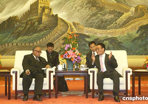 四月十二日,全國(guó)人大常委會(huì)委員長(zhǎng)吳邦國(guó)在北京與孟加拉國(guó)民議會(huì)議長(zhǎng)穆罕默德·賈米爾烏丁·西爾卡舉行會(huì)談。作者:廖文靜