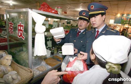為了減少白色污染,北京市工商局對(duì)集貿(mào)市場(chǎng)和餐館使用的塑料袋和一次性塑料餐具進(jìn)行專項(xiàng)檢查。東城工商分局近日在集貿(mào)市場(chǎng)中,共沒收一萬五千余個(gè)禁止使用的超薄塑料袋和二十余個(gè)一次性發(fā)泡餐盒。作者:羅偉