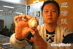 四月十四日,二○○五中國(guó)國(guó)內(nèi)旅游交易會(huì)在廣西桂林開(kāi)幕。廣西民間藝術(shù)家陳樺鳴攜“蛋琢”繪畫(huà)藝術(shù)亮相“旅交會(huì)”。陳樺鳴的蛋琢繪畫(huà)曾獲廣西特色旅游工藝品設(shè)計(jì)大賽銀獎(jiǎng)。圖為陳樺鳴在向游客展示雕琢有毛澤東頭像的“蛋琢”繪畫(huà)品。作者:蔣雪林