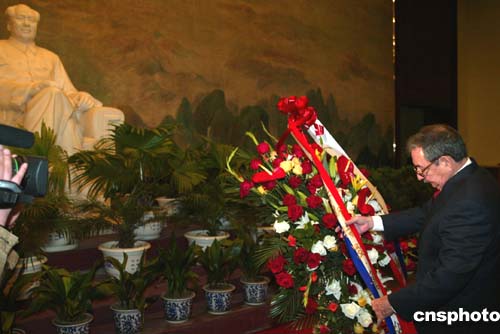 今天的參觀原本不在勞爾此次北京之行的行程安排當(dāng)中,中方應(yīng)勞爾的要求臨時增加了這項活動。勞爾于今天下午四點多抵達(dá)毛主席紀(jì)念堂,在北門外下車后步行來到紀(jì)念堂內(nèi)毛主席座像前,敬獻(xiàn)花圈并三鞠躬致敬。隨后,勞爾一行靜靜地瞻仰了毛主席遺容。