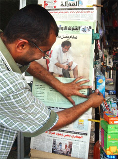 5月21日的英國(guó)《太陽(yáng)報(bào)》再次刊登了薩達(dá)姆在獄中的照片,圖為伊拉克的報(bào)亭出售刊有相關(guān)圖片的報(bào)紙。 (春風(fēng))