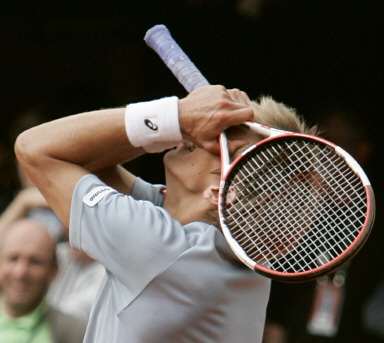 中新網(wǎng)4月25日電 在昨天晚上結(jié)束的法網(wǎng)男單下半?yún)^(qū)首輪比賽中,美國(guó)老將阿加西苦戰(zhàn)5盤,以2比3(5比7/6比4/7比6/1比6/0比6)不敵芬蘭的資格賽選手涅米寧,慘遭淘汰出局。江南時(shí)報(bào)報(bào)道,這也是阿加西連續(xù)兩年在法網(wǎng)首輪出局。