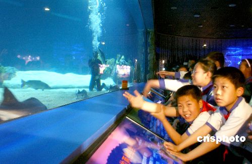 五月二十六日,北京“環(huán)保小衛(wèi)士”在中華鱘館觀(guān)看科研人員在水下對(duì)中華鱘投喂鯽魚(yú)。作者:韓藝冰