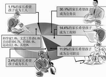 中新網(wǎng)5月30日電 據(jù)新民晚報(bào)報(bào)道,你希望孩子將來做什么?近三分之一的家長(zhǎng)選擇了公務(wù)員,只有1.1%的家長(zhǎng)希望孩子成為工人。日前由市質(zhì)量協(xié)會(huì)用戶評(píng)價(jià)中心發(fā)布的《上海中小學(xué)生成長(zhǎng)質(zhì)量調(diào)查報(bào)告》揭示了當(dāng)前家庭教育中存在的不少問題。