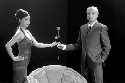 5月30日下午,記者走進(jìn)煤礦文工團(tuán)的安源小劇場(chǎng),只見(jiàn)陶虹身穿一件紫紅色的露肩晚禮服,徐崢則穿著一身筆挺的西服。他們兩人分別站在一個(gè)紅色布藝沙發(fā)的兩側(cè),頭頂上是大量的聚光燈。劇場(chǎng)里的陣勢(shì)和時(shí)尚節(jié)目的拍攝別無(wú)二致?墒,陶虹、徐崢卻是在為他們二人主演的戲劇《最后一個(gè)情圣》拍攝電視宣傳片。