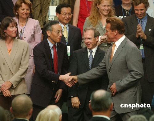 圖:施瓦辛格與美籍華人科學家朱棣文握手致意