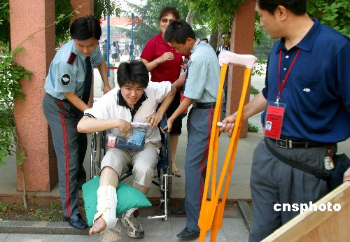 6月7日早晨8點30分,濟南山東師大附中2005年高考考點,千余名考生開始步入考場。山東師大附中的考生王恒考前因事故不幸腿骨骨折,他在保安隊員的幫助下,被特許提前入場。作者:周青先