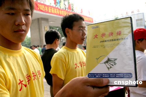 6月7日是全國高考開考的第一天,鄭州多個考點聚集著身穿“志愿填報專家”的工作人員向廣大考生和家長宣傳推銷“2005高考志愿填報”的相關(guān)資料。作者:陳代述
