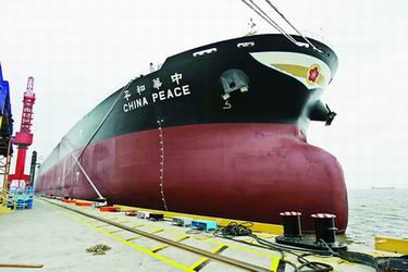 一艘比正規(guī)足球場(chǎng)大兩倍、十多層樓高的巨輪,停泊在上海外高橋船廠碼頭上。她正是數(shù)百家中國大陸、臺(tái)灣和香港地區(qū)媒體近半個(gè)月內(nèi)追逐的目標(biāo)——長289米、型寬45米、型深24.5米的17.5萬噸好望角型散貨船。