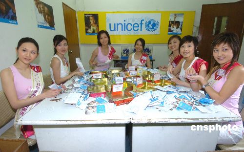 參加《2005年度香港小姐競(jìng)選》20位候選佳麗9日來(lái)到香港聯(lián)合國(guó)兒童基金會(huì)﹐將社會(huì)捐助的各種錢(qián)幣進(jìn)行整理﹐以此來(lái)表達(dá)對(duì)有需要人士的幫助。作者:趙振清