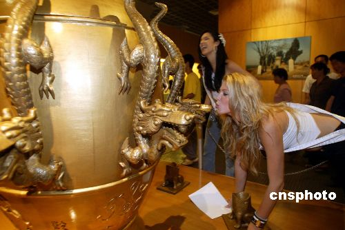 六月十一日,參加二零零五國際旅游小姐冠軍總決賽的來自七十五個國家和地區(qū)的佳麗,來到河南省鄭州市,開始河南巡游之旅,暢游美麗中原,感受黃河風情,體驗悠久歷史。圖為鄭州河南博物院根據歷史記載復原的地動儀吸引參賽佳麗。作者:盛佳鵬