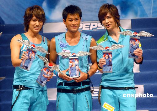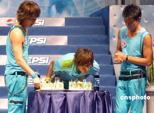 中新網(wǎng)6月17日電 據(jù)香港媒體報(bào)道,古天樂、言承旭(Jerry)及周渝民(仔仔),前晚一身藍(lán)色裝扮,出席《百事藍(lán)色風(fēng)暴615公告首部曲》記者會(huì),吸引了五百歌迷捧場,場面熱鬧。由于仔仔上周四生日,古仔及Jerry特別送上蛋糕慶祝,Jerry更當(dāng)場飛擒咬吻仔仔。至于仔仔的生日愿望,則是身體健康、支持F4、古天樂及百事。