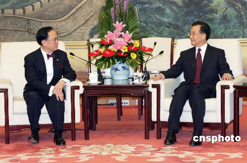 今天上午九時(shí)十五分許,在人民大會(huì)堂香港廳簡(jiǎn)單隆重的宣誓就職儀式結(jié)束后,溫家寶總理在接待廳會(huì)見了曾蔭權(quán)。