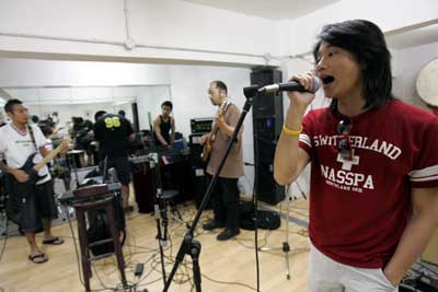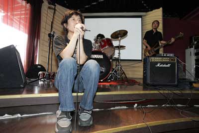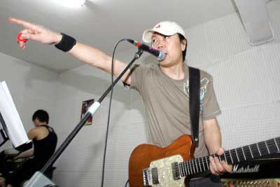 在女人街的一酒吧內,燙著卷發(fā)的鄭鈞神采奕奕地出現(xiàn)在記者面前。不過這一回他不得不坐在地上排練了:“我前天去爬山,爬了7個鐘頭啊,下山的時候腿受傷了,現(xiàn)在下樓梯都不能彎。”鄭鈞向記者們“展示”了他的搖滾版《喀秋莎》。