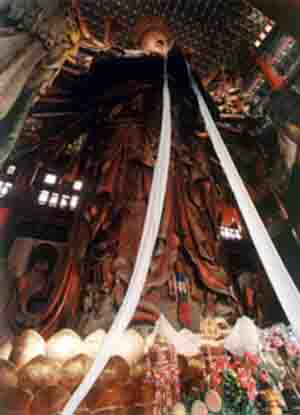 大乘之閣內(nèi)部分為三層,閣內(nèi)矗立一尊金漆木雕千手千眼觀音菩薩,高22.28米,腰圍15米,重達(dá)110噸,用木材120立方米,是現(xiàn)在世界上最高大的木質(zhì)雕像。