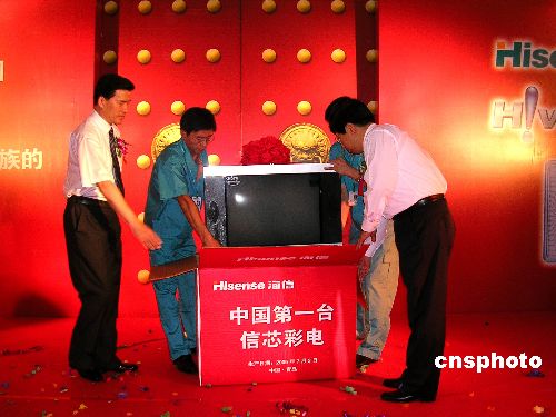 今天在此間海信集團(tuán)研發(fā)中心舉行的儀式上,青島市市長夏耕和海信集團(tuán)董事長周厚健為第一臺(tái)下線的裝有“信芯”的海信高清彩電封箱。隨后,青島市副市長吳經(jīng)建代表市政府宣布,獎(jiǎng)勵(lì)海信研發(fā)團(tuán)隊(duì)二百萬元人民幣。海信集團(tuán)也表示把首批一百臺(tái)“信芯”彩電捐贈(zèng)給分布在西部地區(qū)的三十所海信希望小學(xué)。