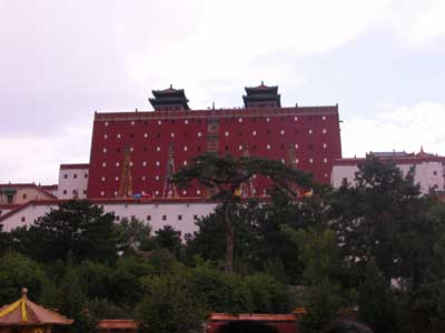 這座“小布達拉宮”始建1767年,歷經(jīng)4年竣工。它仿照了西藏布達拉宮“城”和山頂兩個部分,墻壁紅白相間,有藏式平頂?shù)锓俊⒉厥脚_塔、藏式殿堂等,但它又不僅是西藏布達拉宮的復(fù)制品,它在模仿中融合了漢族建筑傳統(tǒng),“漢藏合一式”的建筑特色在這棟占地22萬平方米的寺廟中隨處可見。