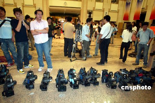 七月十六日晚,中國國民黨主席選舉揭曉,臺北市長馬英九高票當選。圖為眾多媒體在臺北國民黨中央黨部等待新主席露面。作者:盛佳鵬
