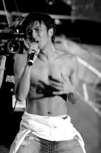 謝霆鋒最后出場做壓軸表演,第一首歌唱完后,他突然脫掉上衣,表示要和歌迷一起淋雨,并猛往身上澆水。霆鋒越唱越興奮,竟把鞋子也踢掉,不停地滿場奔跑,令歌迷瘋狂不已。
