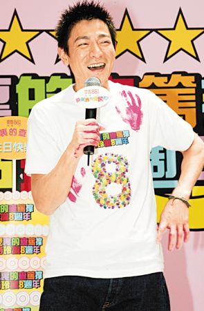 華仔昨日與商臺節(jié)目主持人查小欣為“茶煲里的查篤撐──8路玲瓏8周年”慶;顒訐(dān)任揭幕主禮嘉賓,并親自設(shè)計了一件以手印砌成“8”字的T恤,喻意“傳媒圈”和“藝人圈”是互相關(guān)連,二人更即場乘升降臺到半空為大型T恤進行“打手印”儀式,為安全起見,商臺亦為二人投保了8位數(shù)字金額。