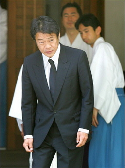 據(jù)香港媒體引述報道,在日本戰(zhàn)敗紀(jì)念日60周年前夕,中川昭一今日身穿黑色衣服,乘座駕抵達(dá)靖國神社參拜。他早前曾經(jīng)表示,參拜靖國神社是為了“祈求和平和誓言永不啟戰(zhàn)”。
