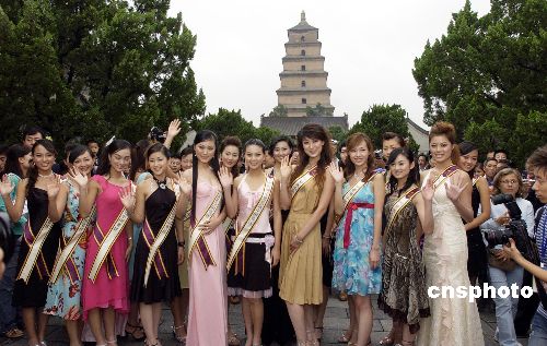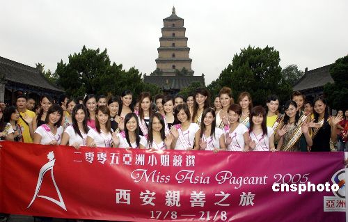 8月17日,參加西安“2005亞洲小姐總決賽”的20位內(nèi)地妙齡佳麗以及來自香港的12位選手和上屆冠軍呂晶晶、馮梓瑩一行抵達(dá)古城西安,并游覽了久負(fù)盛名的大慈恩寺,吸引了眾多中外游客。作者:侯智