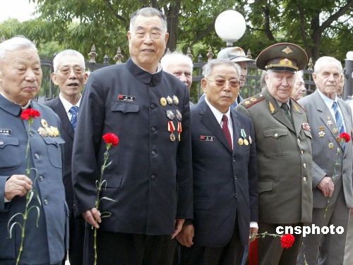 八月十八日,被邀請參加“和平使命—2005”中俄聯(lián)合軍事演習(xí)開幕儀式的中國抗日老戰(zhàn)士和前蘇聯(lián)戰(zhàn)爭功勛軍人,來到“太平洋艦隊?wèi)?zhàn)斗榮譽(yù)”紀(jì)念碑敬獻(xiàn)花圈,向在衛(wèi)國戰(zhàn)爭中英勇犧牲的俄羅斯軍人致以崇高的敬意。作者:王麗南