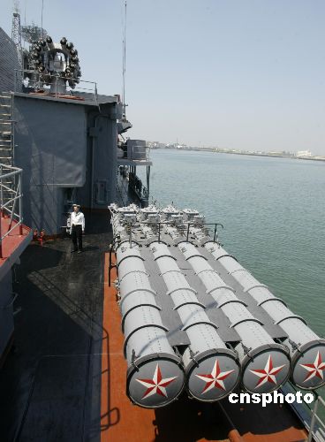 八月二十二日,中國部分媒體被俄軍方邀請,參觀采訪此次參加演習的俄羅斯反潛艦,這艘停靠在青島港的艦艇正整裝待發(fā),明日將起航參加海上封鎖演習。圖為反潛艦的一角。作者:王麗南