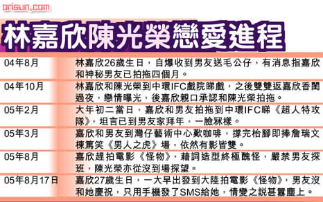 嘉欣和陳光榮自去年四月開(kāi)始拍拖,陳光榮是鄭伊健御用唱片監(jiān)制,嘉欣經(jīng)伊健介紹認(rèn)識(shí)陳光榮,最初兩人只是好朋友,后來(lái)陳光榮和妻子婚姻出現(xiàn)問(wèn)題,嘉欣常陪在身邊為他分憂(yōu),結(jié)果在陳光榮和妻子離婚后,兩人擦出愛(ài)火熱戀,去年十月兩人拍拖到看戲,陳光榮當(dāng)晚更到嘉欣香閨過(guò)夜,被傳媒踢爆戀情。
