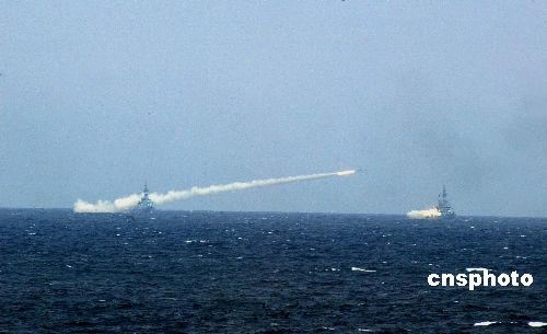 八月二十三日,“和平使命——2005”中俄聯(lián)合軍事演習(xí)第三階段在中國(guó)山東半島及其附近海域進(jìn)行。圖為多艘護(hù)衛(wèi)艦齊射艦艦導(dǎo)彈。作者:王麗南
